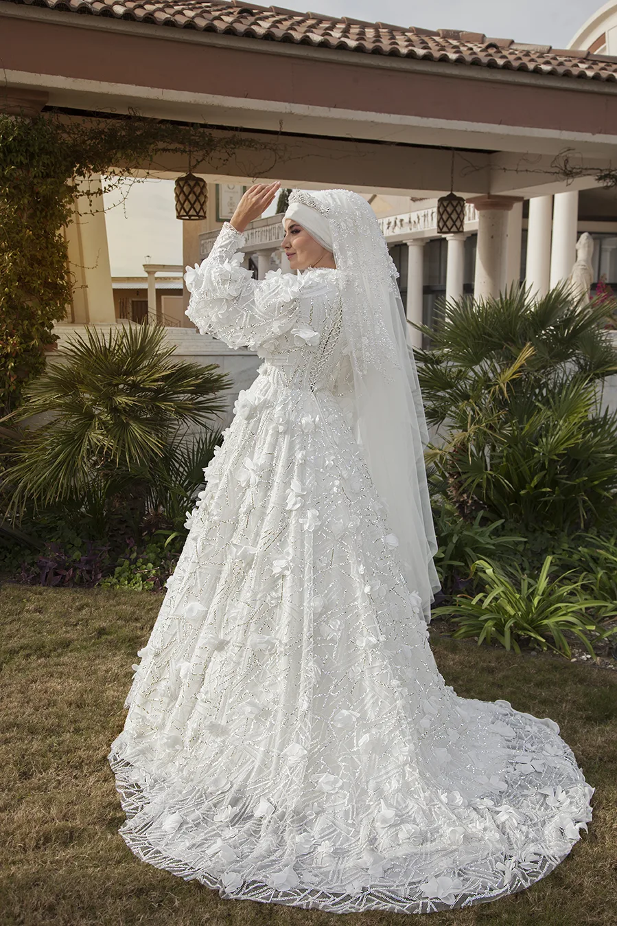 Çiçek detaylı tesettür gelinlik.