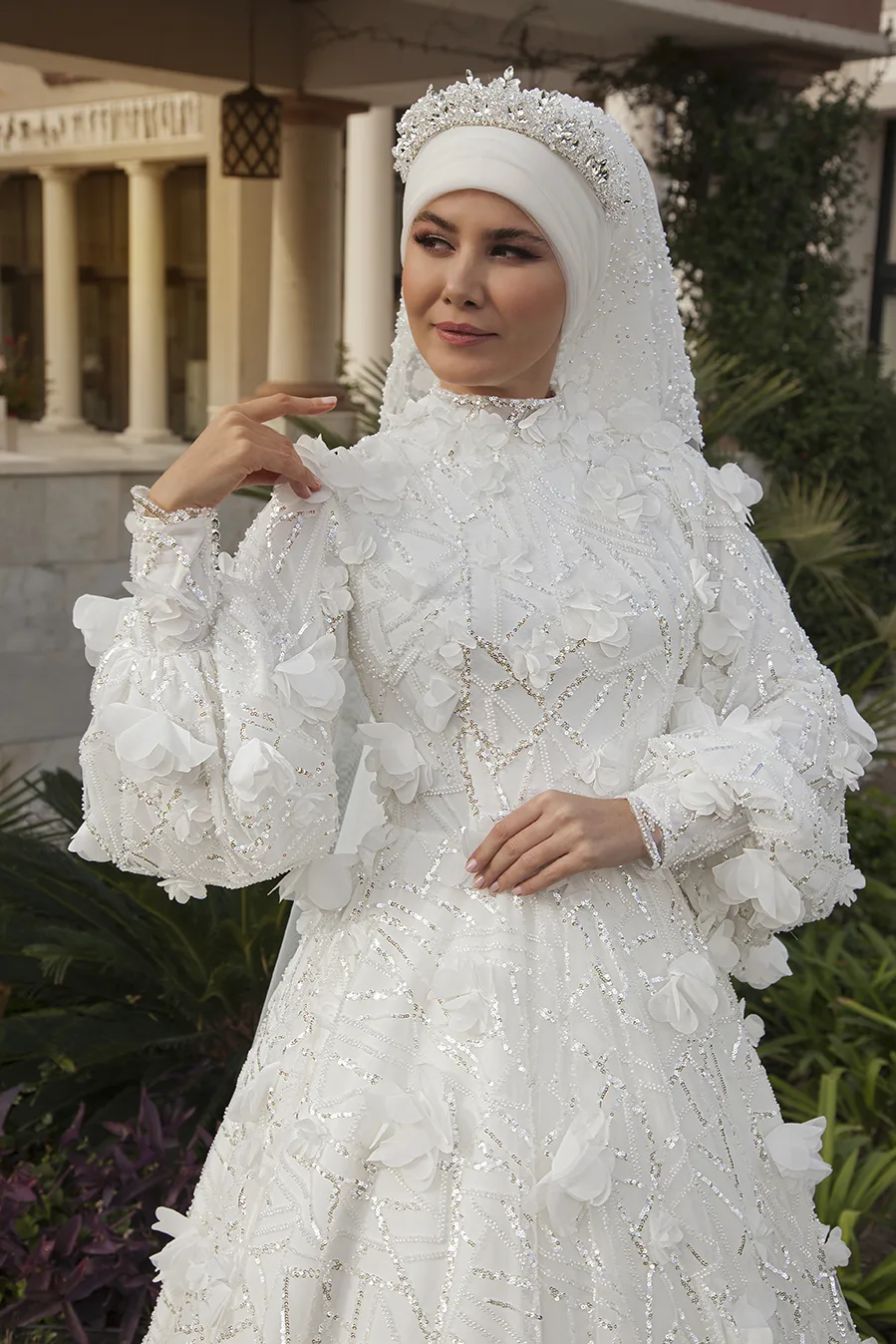 <p>Çiçek detaylı tesettür gelinlik.</p>